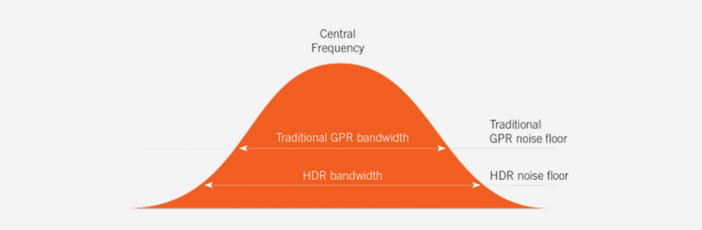 La tecnología MALÅ HDR produce datos con niveles de ruido significativamente más bajos en comparación con los sistemas GPR tradicionales. Un umbral de ruido más bajo proporciona un ancho de banda más amplio en comparación con los sistemas convencionales de tiempo entrelazado. Esto elimina una mayor parte de la interferencia de fondo, ofreciendo datos más nítidos con mayor contraste y la capacidad de ver a mayor profundidad que los sistemas que no son HDR.